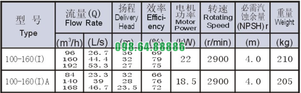 Bảng thông số kỹ thuật bơm nước trục ngang SLW100- ISW100-160-I lưu lượng 53.3 L/s