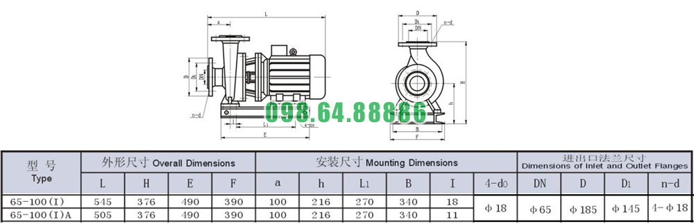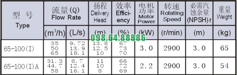 Bảng thông số kỹ thuật bơm nước trục ngang SLW65-ISW65-100-I động cơ 3 kw