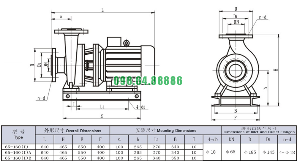 Bản vẽ cấu tạo và kích thước bơm nước trục ngang SLW65-ISW65-160-I đẩy cao max 35m