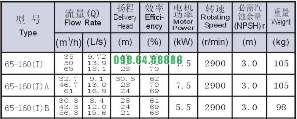 Bảng thông số kỹ thuật bơm nước trục ngang SLW65-ISW65-160-I đẩy cao max 35m