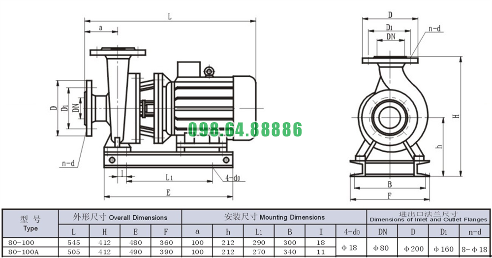 Bản vẽ cấu tạo và kích thước bơm nước trục ngang SLW80-ISW80-100 đẩy cao max 13.8m