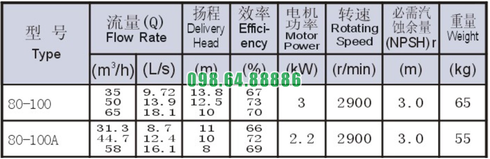 Bảng thông số kỹ thuật bơm nước trục ngang SLW80-ISW80-100 đẩy cao max 13.8m