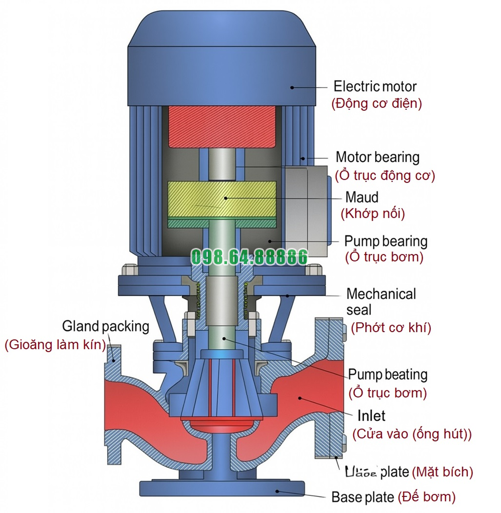 Động cơ và bơm được lắp trực tiếp trên cùng một trục, không qua bộ truyền đai hoặc khớp nối rời. Điều này mang lại nhiều lợi ích: