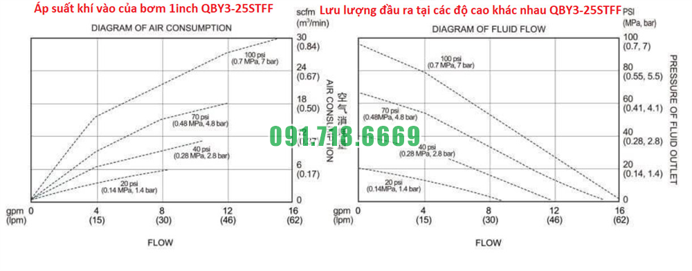 Đường cong hiệu suất của máy bơm màng QBY3-25STFF vật liệu nhựa PP