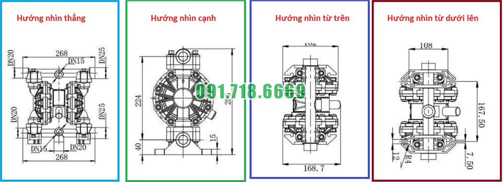 Bản vẽ kích thước của máy bơm màng QBY3-25STFF vật liệu nhựa PP