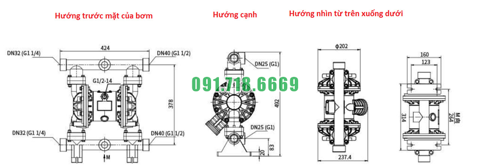 Bản vẽ kích thước của máy bơm màng QBY3-40STFF vật liệu nhựa PP