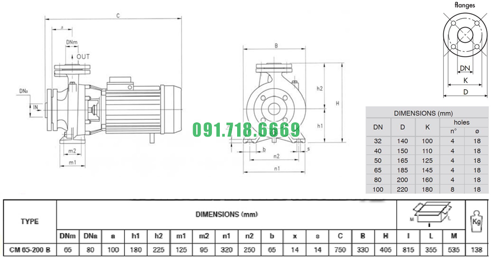 Thông số kỹ thuật máy bơm nước sạch li tâm CM65-200B kích thước 65 mm