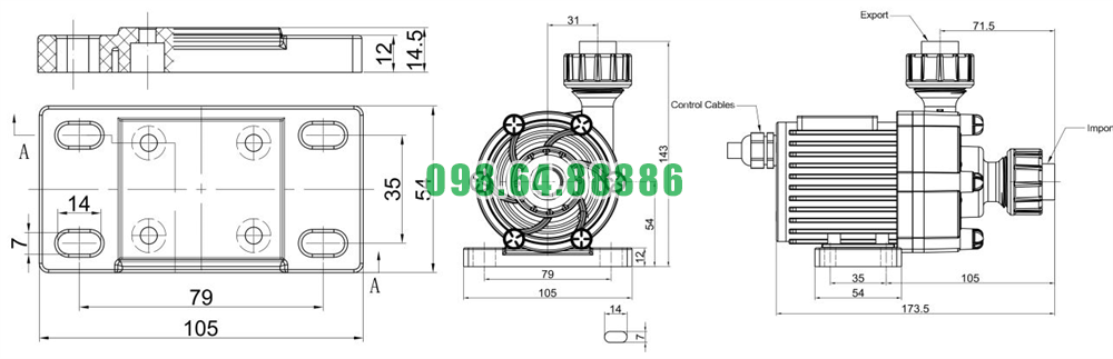 Cấu tạo và kích thước bản vẽ bơm hóa chất TDM-550PERU-DC48-DC hiệu suất 55L/m