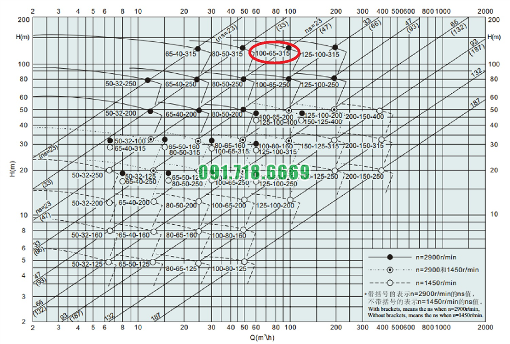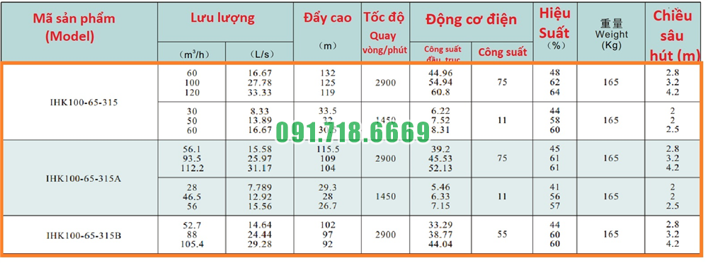 Bảng lưu lượng của bơm li tâm cánh hở lưu lượng 120 m3/h model IHK100-65-315