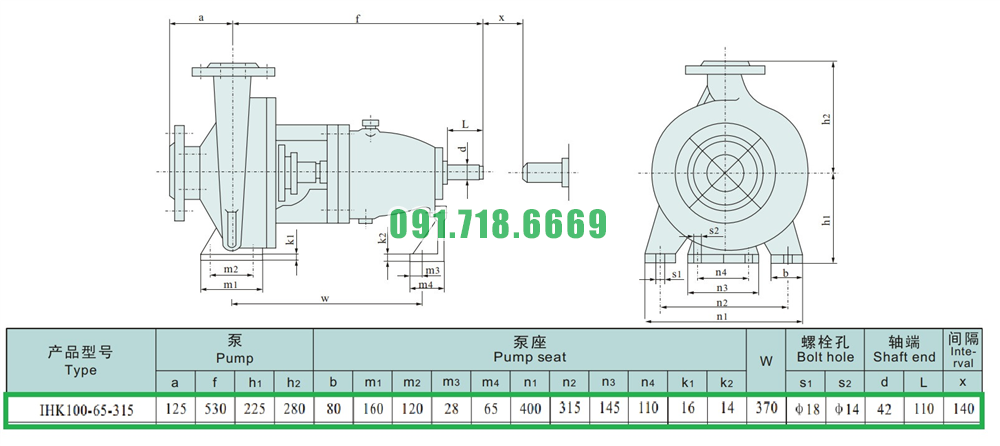 Kích thước của đầu bơm li tâm cánh hở lưu lượng 120 m3/h model IHK100-65-315