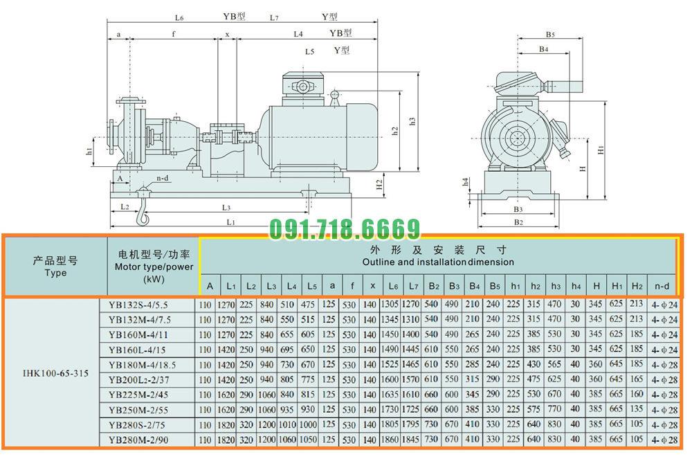 Kích thước lắp đặt của bơm li tâm cánh hở lưu lượng 120 m3/h model IHK100-65-315