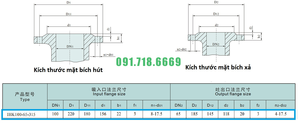Kích thước mặt bích của bơm li tâm cánh hở lưu lượng 120 m3/h model IHK100-65-315