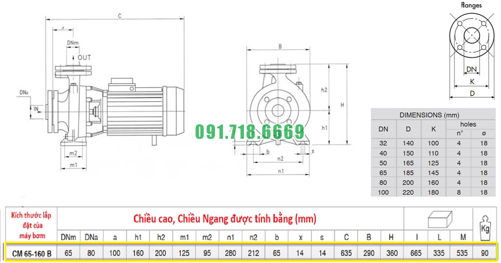 Kích thước bơm li tâm trục ngang đường thoát 65 mm model CM65-160B
