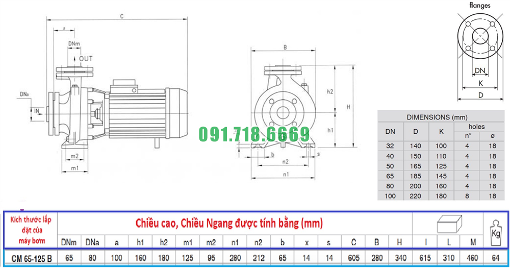 Kích thước máy bơm nước công nghiệp CM65-125B