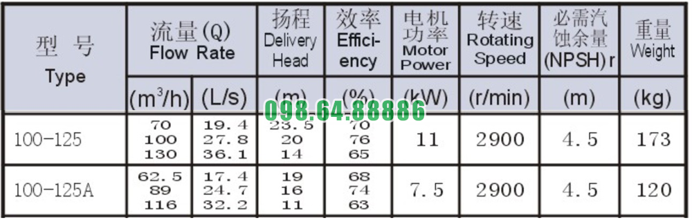 Bảng thông số kỹ thuật bơm nước trục ngang SLW100-ISW100-125 động cơ 11 kw lưu lượng 130 m3/h
