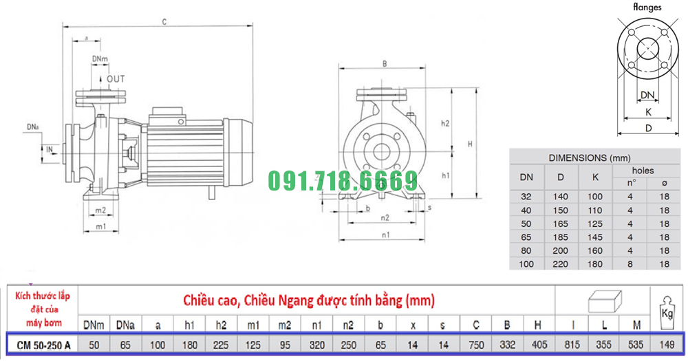 Kích thước máy bơm nước sạch li tâm trục ngang CM50-250A điện áp 380v