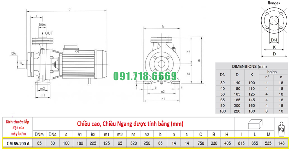 Kích thước máy bơm nước sạch li tâm trục ngang CM65-200A