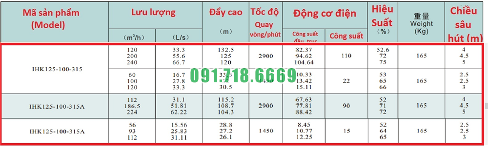 Bảng lưu lượng của máy bơm cánh hở li tâm trục ngang IHK125-100-315 lưu lượng 240 m3/h