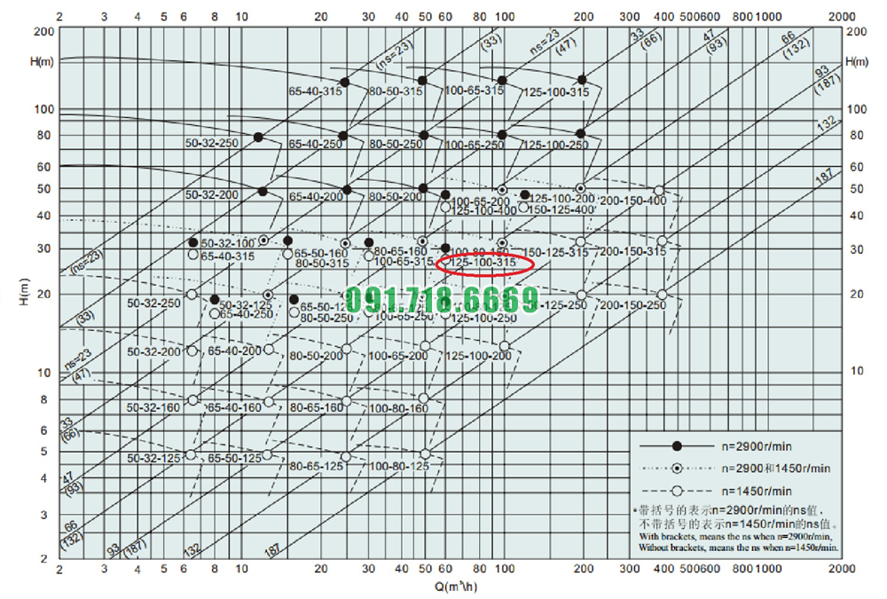 Đường cong hiệu suất của máy bơm cánh hở li tâm trục ngang IHK125-100-315 lưu lượng 240 m3/h