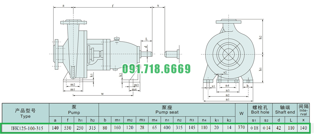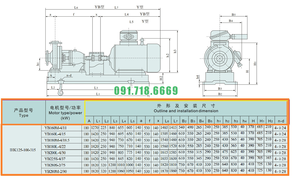 Kích thước của đầu máy bơm cánh hở li tâm trục ngang IHK125-100-315 lưu lượng 240 m3/h