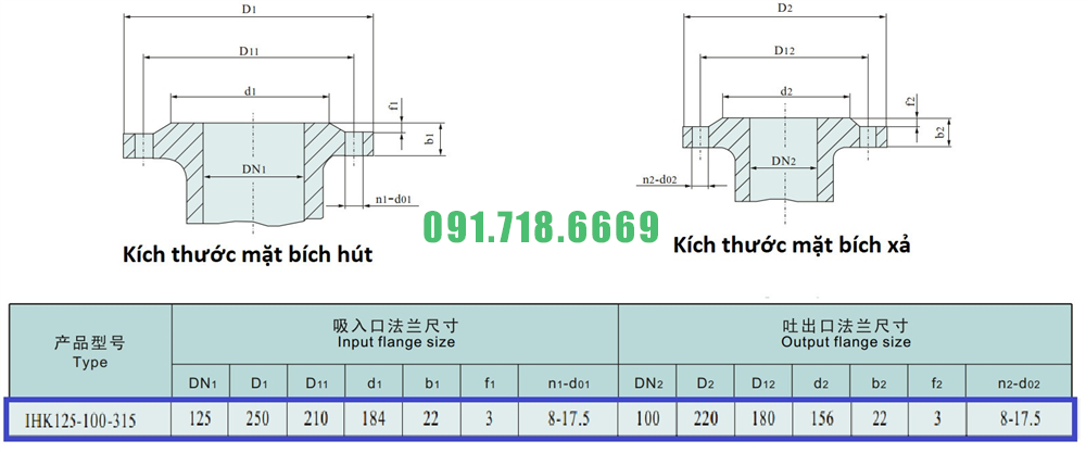 Kích thước mặt bích của máy bơm cánh hở li tâm trục ngang IHK125-100-315 lưu lượng 240 m3/h