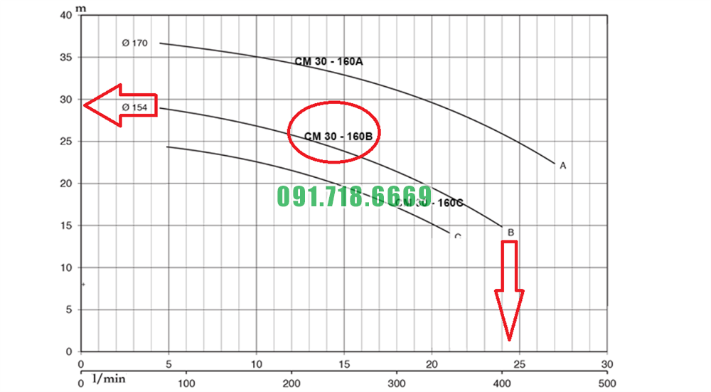 Đường cong hiệu suất máy bơm nước li tâm trục ngang CM32-160B kích thước DN50