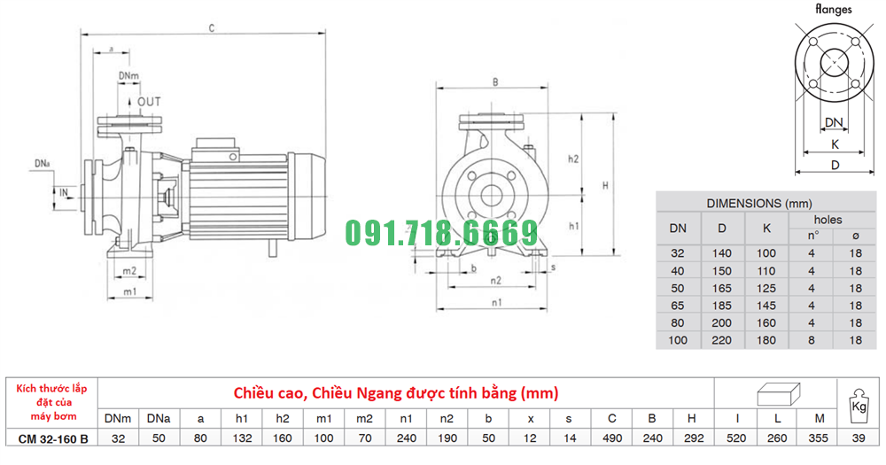 Thông số kỹ thuật máy bơm nước li tâm trục ngang CM32-160B kích thước DN50