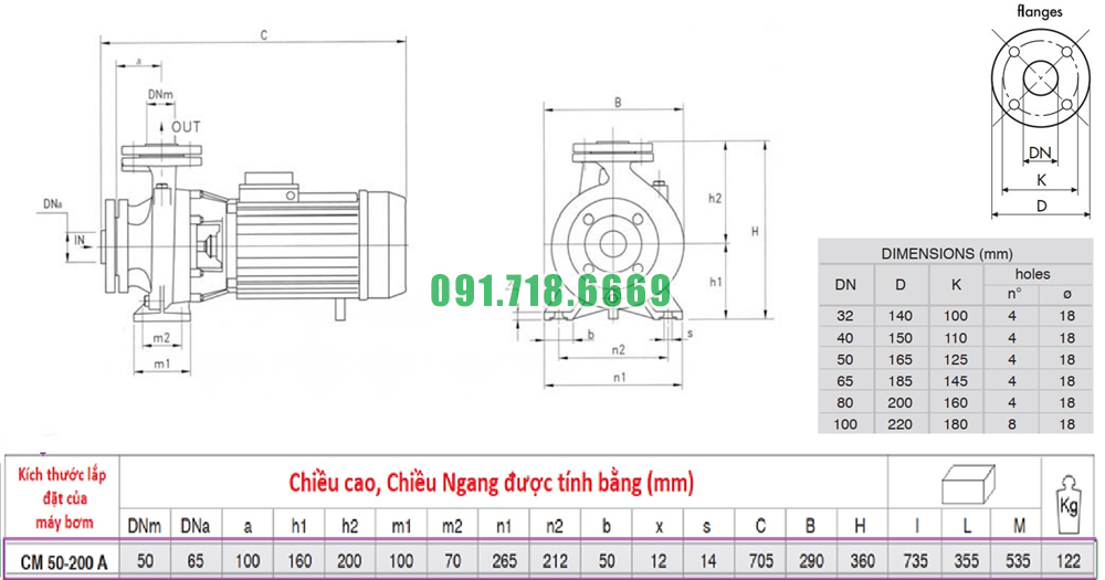 Thông số kỹ thuật máy bơm nước li tâm trục ngang CM50-250C kích thước Dn65