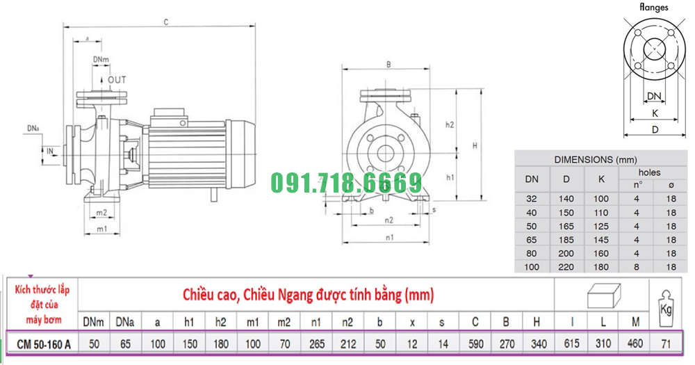 Kích thước máy bơm nước li tâm CM50-160A vật liệu gang FC200